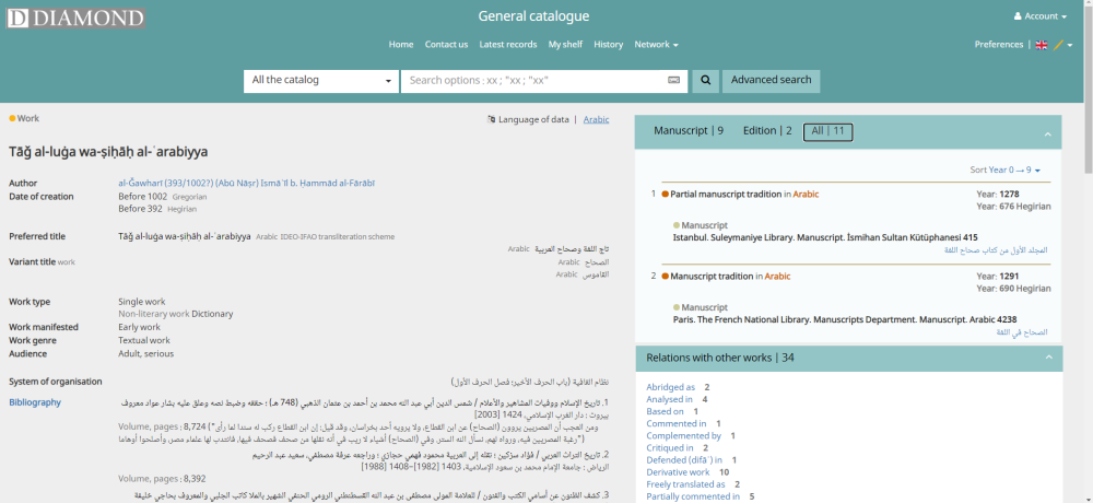 The pioneer work of the IDEO in the field of manuscript cataloging has been rewarded by the Arab League Educational, Cultural and Scientific Organization (ALECSO), on the World Arabic Manuscript Day. Traditionally, libraries manage manuscripts and printed materials in separate catalogs, with no link between them. However, in Islamic studies, a manuscript is a book like any other and researchers read and cite manuscripts in a quite natural way. The online application Diamond, developed by the IDEO for several years, is the only application currently capable of cataloguing manuscripts and printed materials in the same database, according to IFLA-LRM international standards. The immediate consequence of doing so is that the works and the ideas of the authors are highlighted, rather than the types of document, manuscripts or printed, through which we received these works. For two years, the IDEO has been collaborating with the Arabic Manuscripts Institute, which belongs to the Arab League in Cairo. This ALECSO award acknowledges the efforts of the teams from the two institutes. Click here to open the record displayed above…
